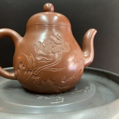 Ấm tư đình gốm nê hưng khắc sen cá thủ công 250ml AKC34
