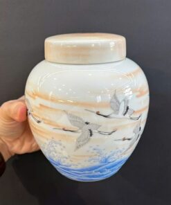 Hũ đựng trà bằng sứ cảnh đức men phấn thái vẽ tay hạc đẹp 7x13x15cm HT52