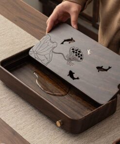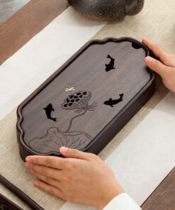 Khay đựng ấm chén bằng gỗ gụ dạng hộp chữ nhật nhỏ hình sen cá 32x15cm KTG14