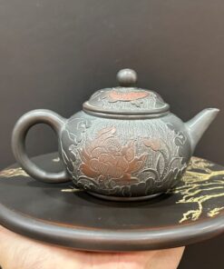Ấm trà hỏa biến đen tử sa nê hưng tây thi khắc hoa mẫu đơn đẹp 240ml AKC257