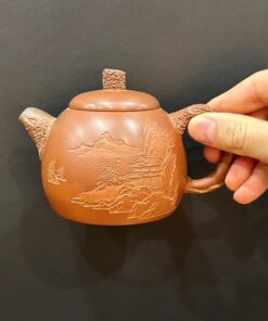 Ấm tử sa nê hưng hỏa biến thủ công gốc tùng khắc sơn thủy 2 màu AKC68