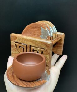 Bộ lót chén gỗ hương tròn đính lá bạc kê ly trà đẹp LC22