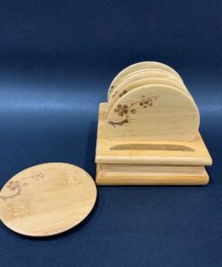 Bộ lót chén trà tre dáng tròn vàng khắc hoa mai đẹp LC33