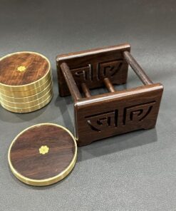 Bộ lót chén trà cao cấp gỗ gụ viền đồng vàng dáng tròn LC40