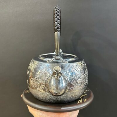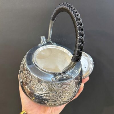 Ấm bạc đun nước nguyên chất 999 gò tay thủ công sơn thủy nổi to đẹp 1.3L 866g AN97