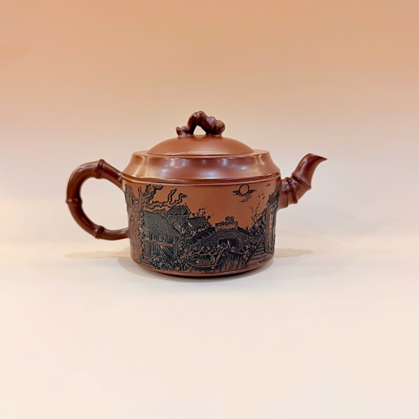 Đặt mua Ấm trà tử sa nê hưng kiến thủy trúc đoạn khắc phố cổ đẹp 250ml AKC282