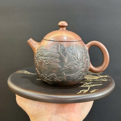 Ấm tử sa long đán kiến thủy nê hưng khắc sơn thủy đẹp 230ml AKC273