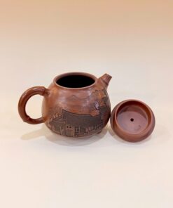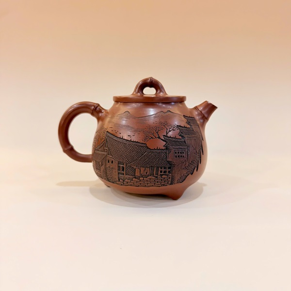 Ấm tử sa Nê Hưng tam túc trúc khắc sơn thủy lâu các 230ml AKC131
