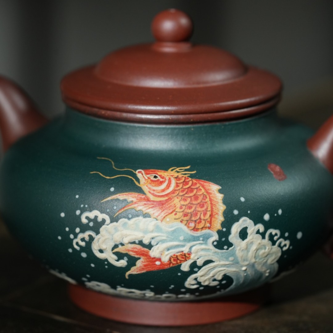 Ấm Tử Sa Đáy Tào Thanh Lục Nê Đất Cũ Đại Bân Cá Hoá Rồng 250ml ATS288