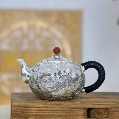 Bộ ấm pha trà bạc nguyên chất 999 gò tay thủ công hoa mẫu đơn đẹp AB86