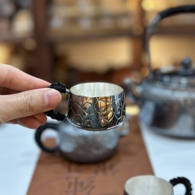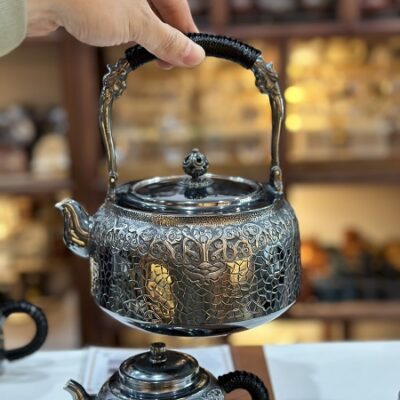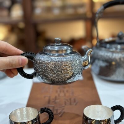 Bộ ấm pha trà bạc nguyên chất 999 gò tay thủ công cảnh băng tan AB81