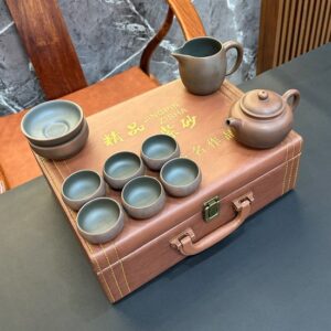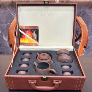Hãy là người đầu tiên nhận xét “Bộ ấm trà tử sa cao cấp nê hưng hỏa biến dáng phỏng cổ hộp da AT71”
