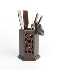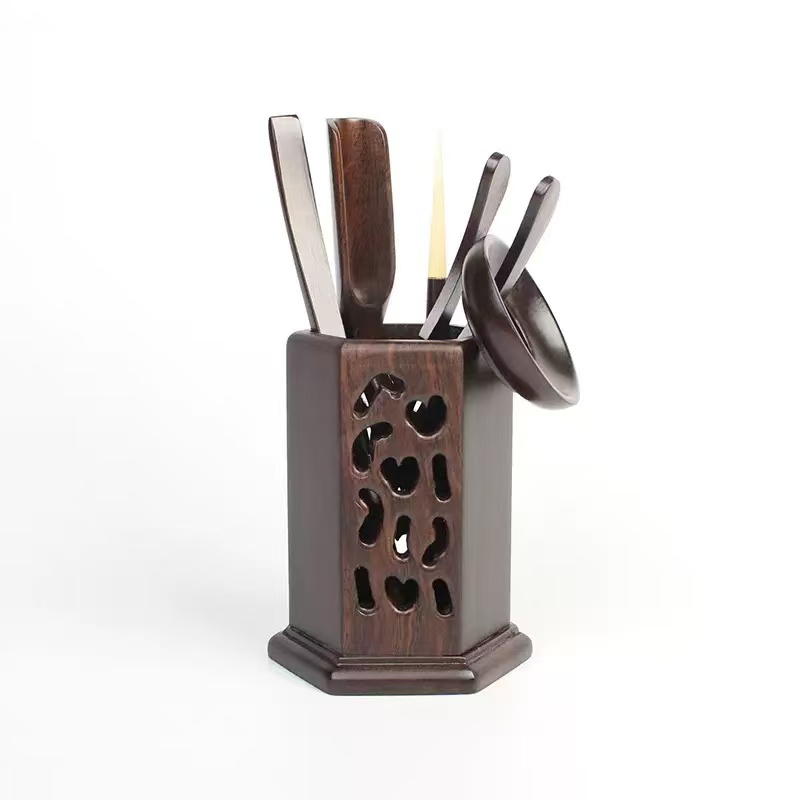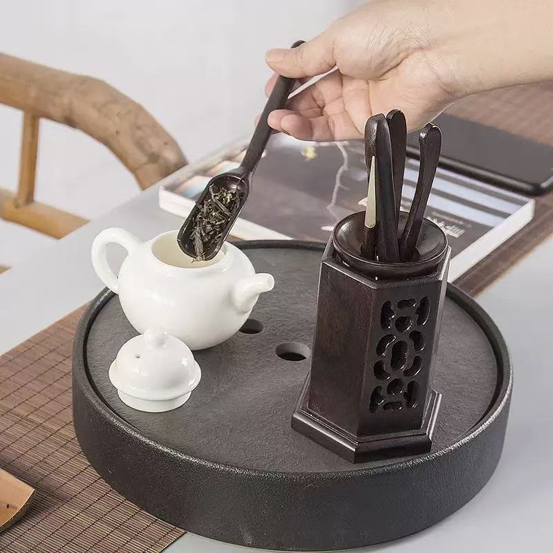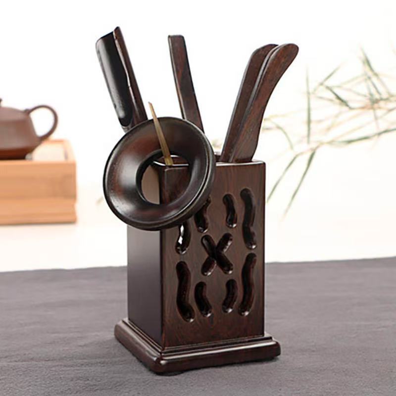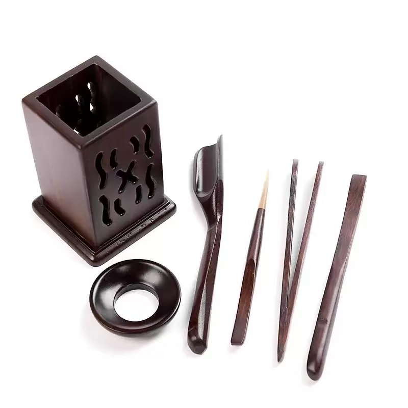 Bộ dụng cụ pha trà gỗ gụ dáng vuông nhiều món bền đẹp dễ cầm thao tác.