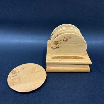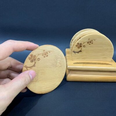 Bộ lót chén trà bằng tre dáng tròn màu vàng khắc hoa đẹp LC33.