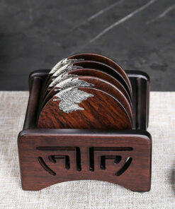 Bộ lót trà gỗ gụ dáng tròn đính lá bạc gồm 6 cái thủ công đẹp làm đế chén.