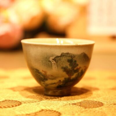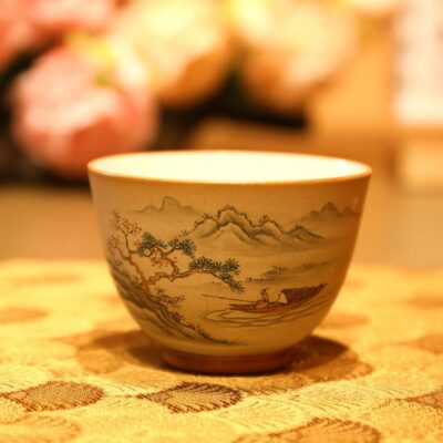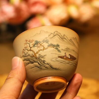 Chén uống trà sứ Cảnh Đức vẽ tay thuyền chài sơn thủy 100ml CS79