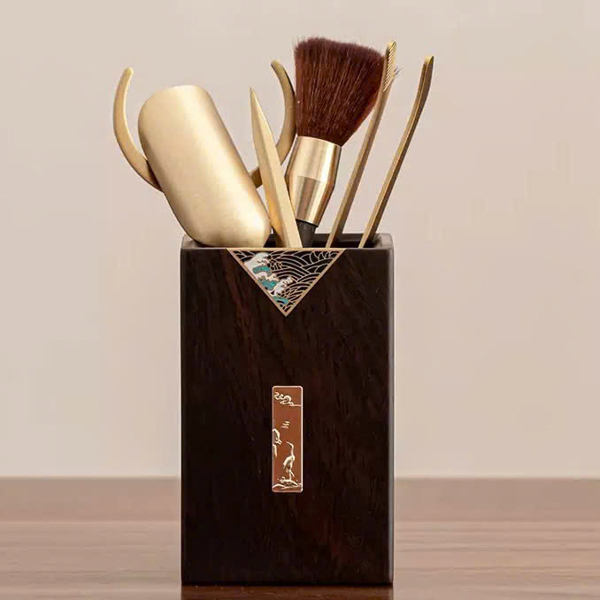 – Bộ sản phẩm gồm: Ống cắm, xúc trà, gắp chén, cây dâng chén, dao tách trà, chổi