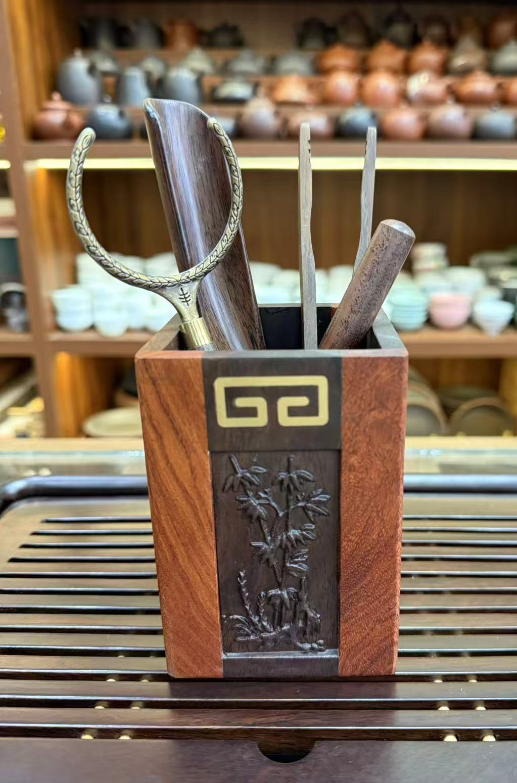 bộ dụng cụ pha trà gỗ có chổi và lọ cắm hoa mai lan cúc sen đẹp pha trà