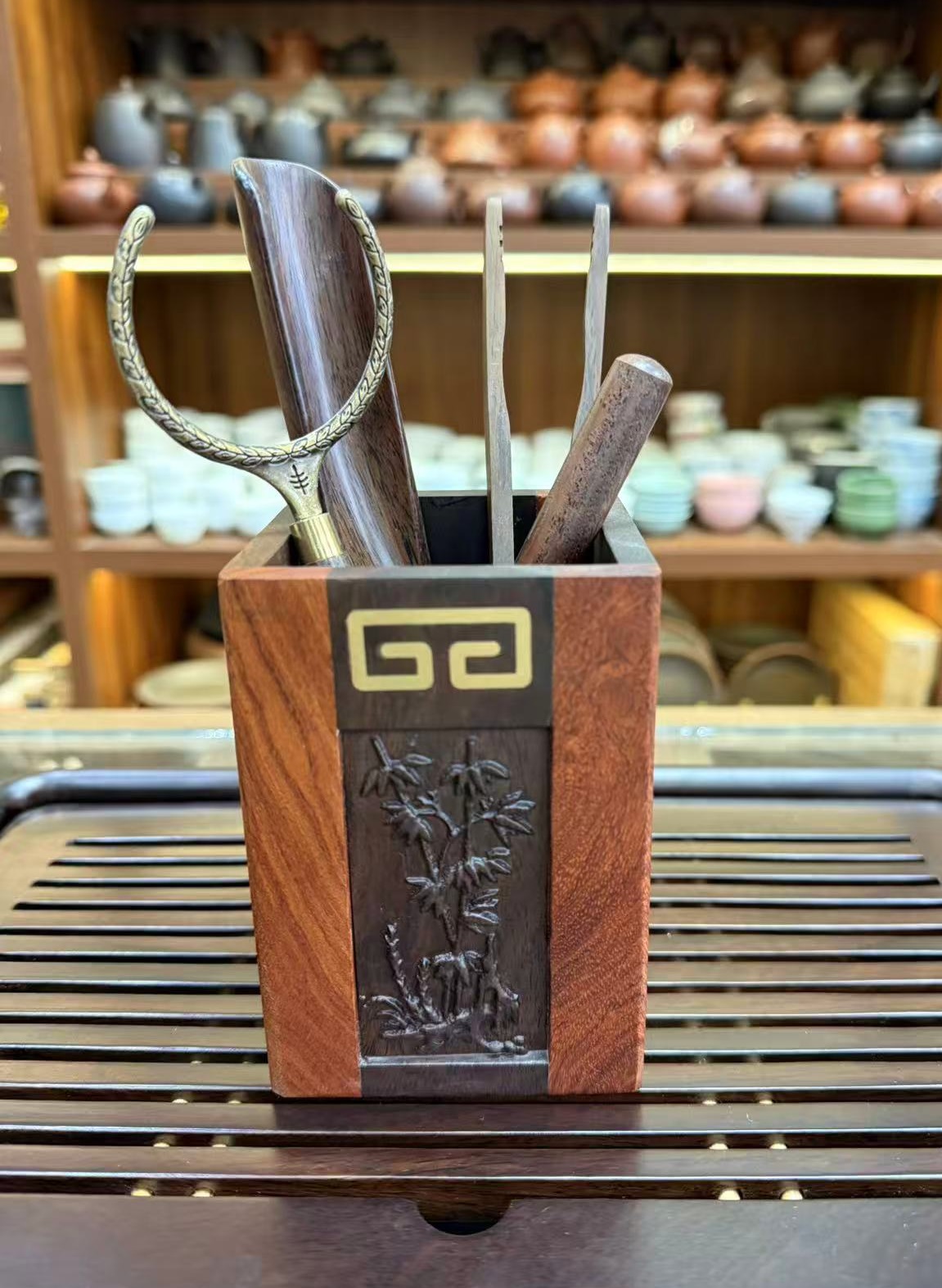 bộ dụng cụ pha trà gỗ có chổi và lọ cắm hoa mai lan cúc sen đẹp pha trà