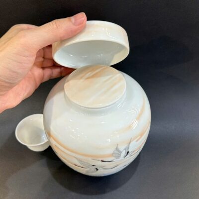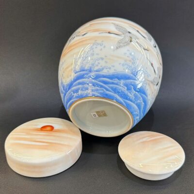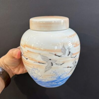 Hũ đựng trà bằng sứ cảnh đức men phấn thái vẽ tay hạc đẹp 7x13x15cm HT52