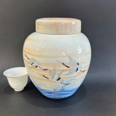 Hũ đựng trà bằng sứ cảnh đức men phấn thái vẽ tay hạc đẹp 7x13x15cm HT52