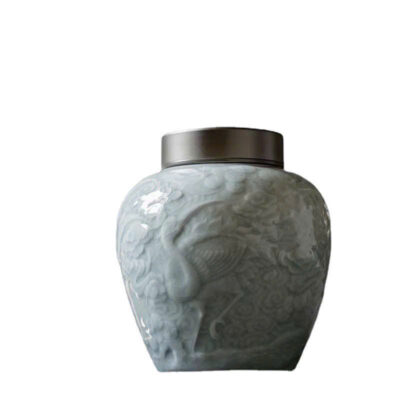 Hũ đựng trà sứ men rạn họa tiết tùng hạc nắp xoáy 2 lớp 900ml HT01