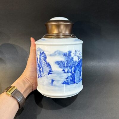 Hũ đựng trà sứ cảnh đức vẽ tay sơn thủy nắp xoáy kín đẹp 1L HT54