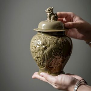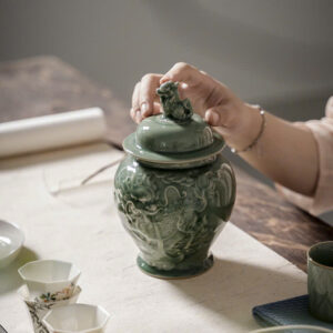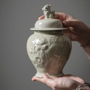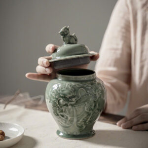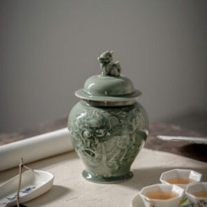 Hãy là người đầu tiên nhận xét “Hũ đựng trà sứ men ngọc họa tiết kỳ lân nắp kín 835ml 20x8cm HT16”