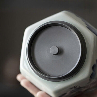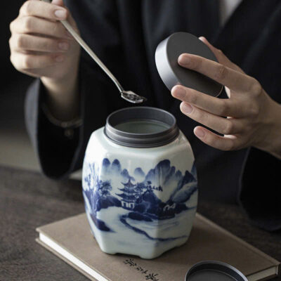 Đặt mua Hũ trà sứ cảnh đức lục giác họa sơn thủy nắp xoáy kín bảo quản trà tốt 800ml HT32