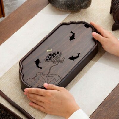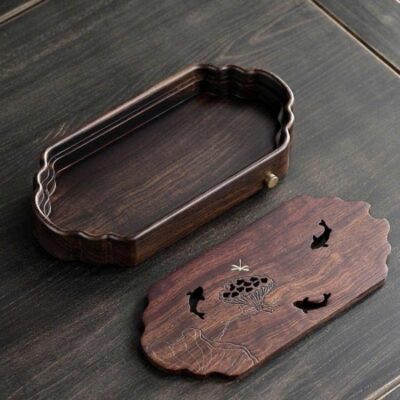 Đặt mua Khay đựng bằng gỗ gụ dạng hộp cỡ nhỏ hình sen cá đẹp 32x15cm KTG13