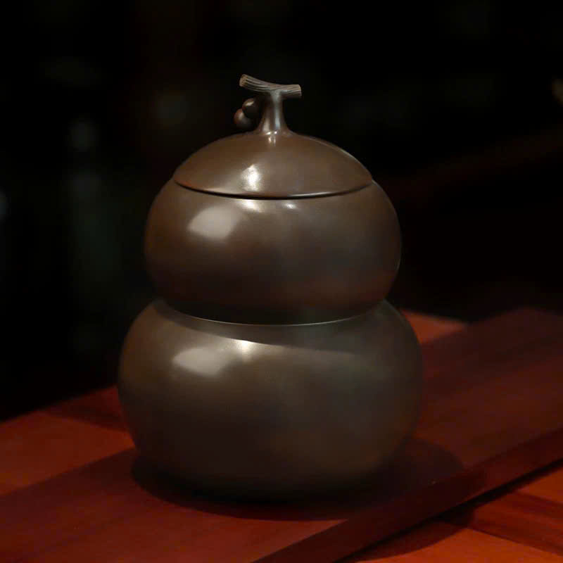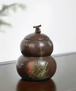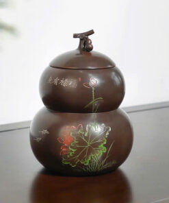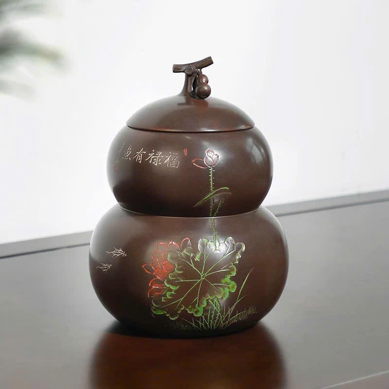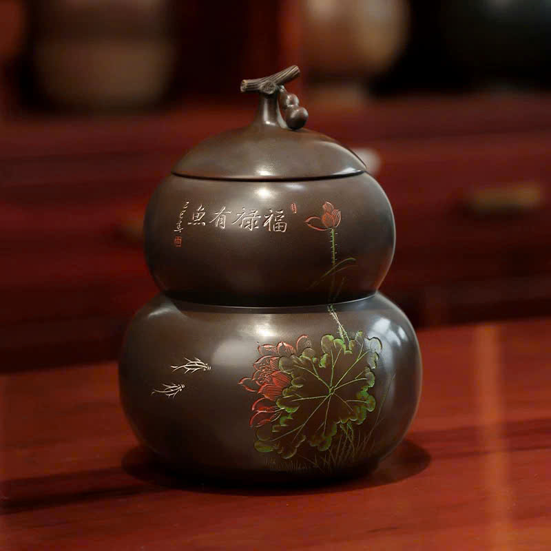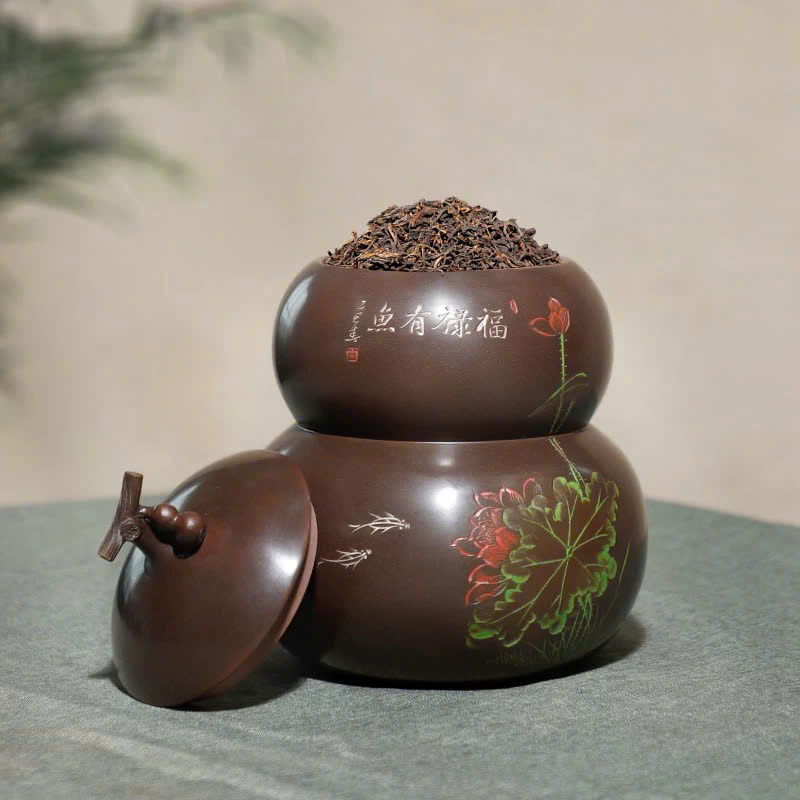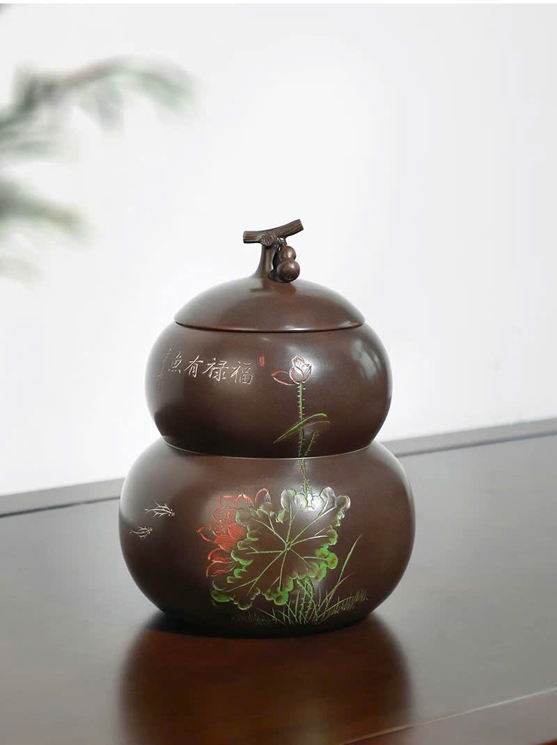 Lọ bảo quản trà lên men tử sa nê hưng hình hồ lô khắc sen đẹp HT94