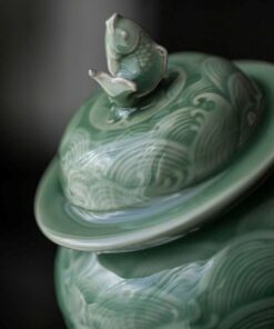Lọ đựng trà bằng sứ cảnh đức men lam họa tiết cá chép đẹp 835ml HT24