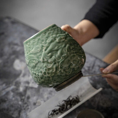 Lọ đựng trà sứ men ngọc cao cấp họa tiết rồng nắp xoáy 900ml HT05