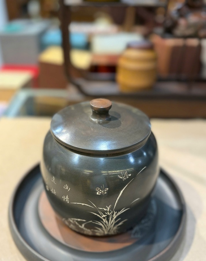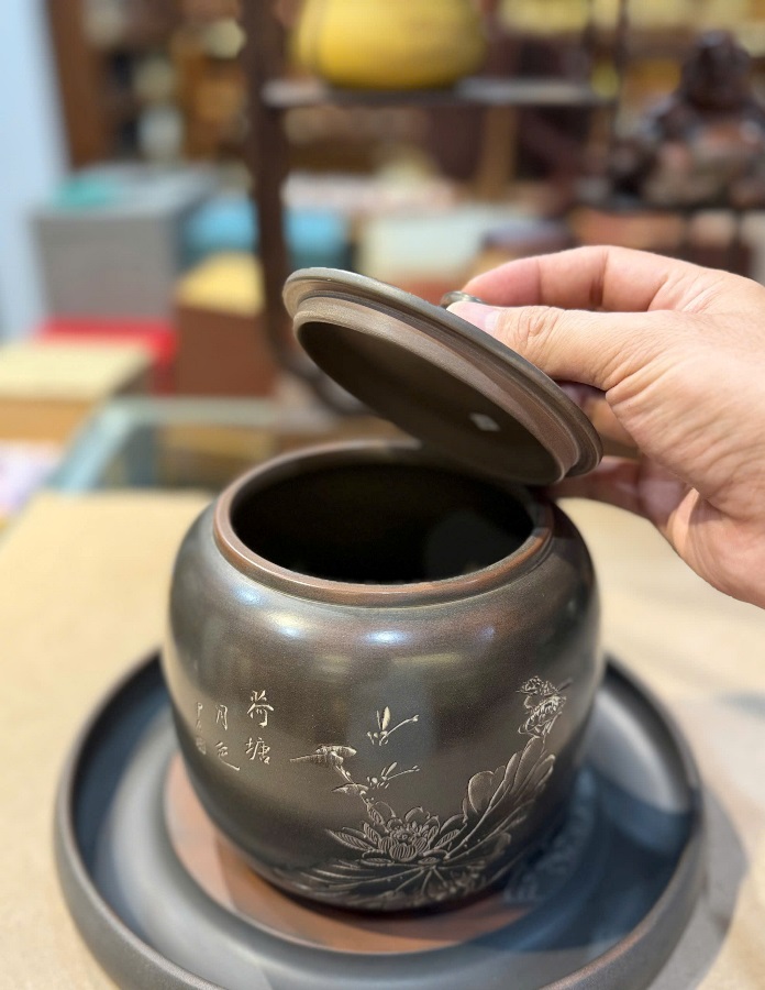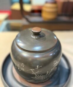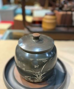 Lọ đựng trà tử sa nê hưng hỏa biến mai lan cúc trúc thủ công dáng thấp HT99.