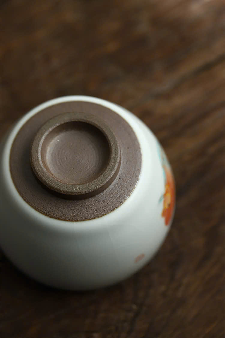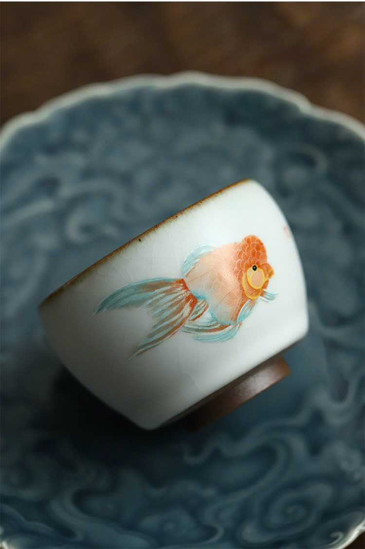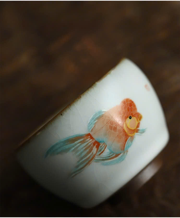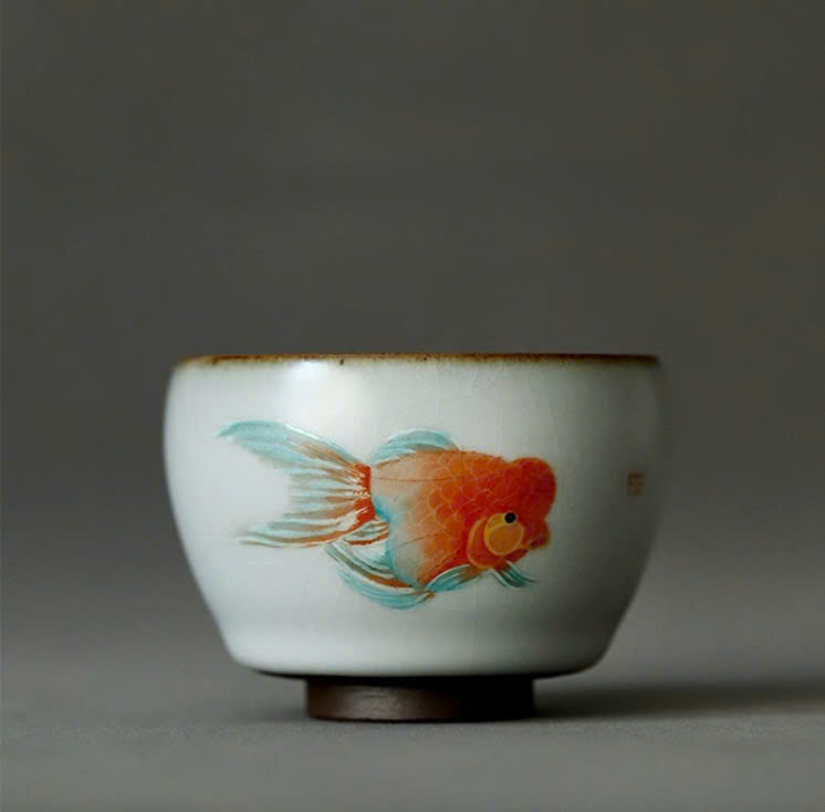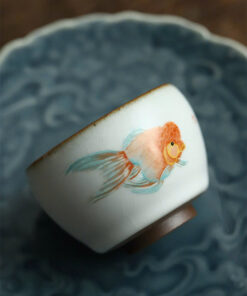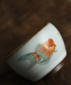 chén sứ cảnh đức gốm thái hội nung củi vẽ tay cá vàng 80ml làm chén trà chủ.